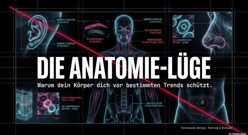 Hier entlarve ich die „Anatomie-Lüge“: Die irrige Vorstellung, dass jeder Körper eine beliebige, beliebig veränderbare Leinwand sei. Nach 15 Jahren an der Nadel weiß ich: Meine wichtigste Fähigkeit ist nicht das Stechen, sondern das „Nein“-Sagen. Die anatomische Eignung bildet die entscheidende Sicherheitsbarriere. Bietet das Gewebe nicht die nötige Tiefe oder Stabilität, wird die Nadel zum Feind. Wir sprechen hier von „Anatomieabhängigkeit“ [Quelle: Lynn Loheide]. Ein Piercing ist kein Aufkleber – es ist ein invasiver Eingriff in ein biologisches System, das seine eigenen, unverrückbaren Regeln schreibt. Wer diese Regeln ignoriert, erntet keine Ästhetik, sondern Narben.